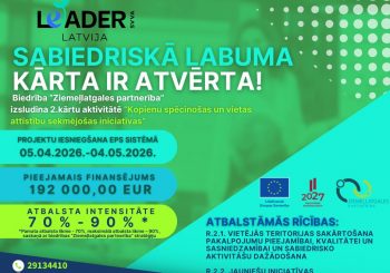 Biedrība “Ziemeļlatgales partnerība” izsludina atklātu projektu iesniegumu pieņemšanas atvērto 95.kārtu Eiropas Savienības Eiropas Lauksaimniecības fonda lauku attīstībai Kopējās lauksaimniecības politikas stratēģiskā plāna 2023.-2027.gadam intervences LA19 “Darbību īstenošana saskaņā ar sabiedrības virzītas vietējās attīstības stratēģiju, tostarp sadarbības aktivitātes un to sagatavošana” aktivit...
