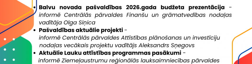 • Balvu novada pašvaldības 2026.gada budžeta prezentācija – informē Centrālās pārvaldes Finanšu un grāmatvedības nodaļas vadītāja Olga Siņica